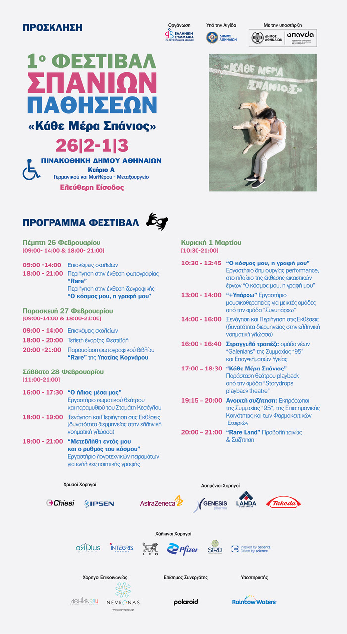 Ο Σύλλογος «95», Ελληνική Συμμαχία για τους Σπάνιους Ασθενείς διοργανώνει για πρώτη φορά το φεστιβάλ «Κάθε Μέρα Σπάνιος», το πρώτο φεστιβάλ στην Ελλάδα αφιερωμένο στη σπανιότητα, τους ασθενείς, τις οικογένειές τους και τους φροντιστές τους.