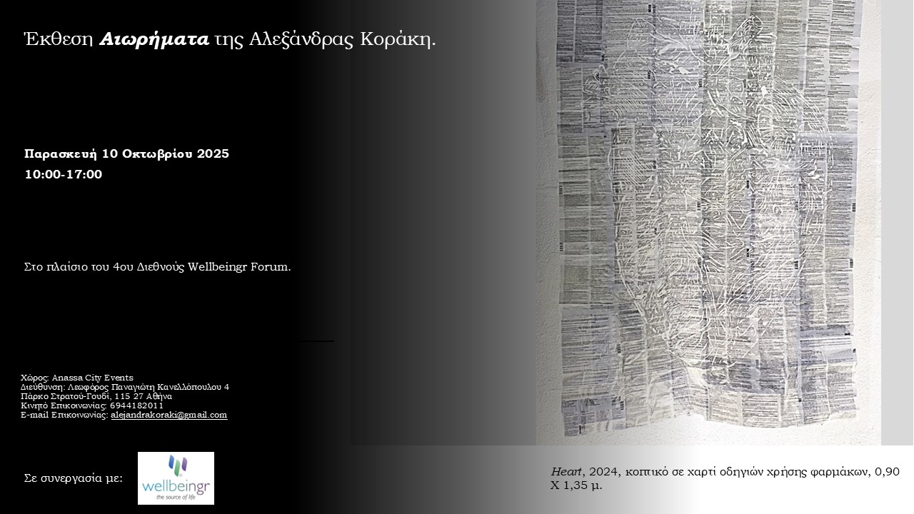 Kατά τη διάρκεια του Forum στο χώρο Anassa θα διεξαχθεί παράλληλα (10:00-17:00) η Έκθεση "Αιωρήματα" της εικαστικού Αλεξάνδρας Κοράκη.