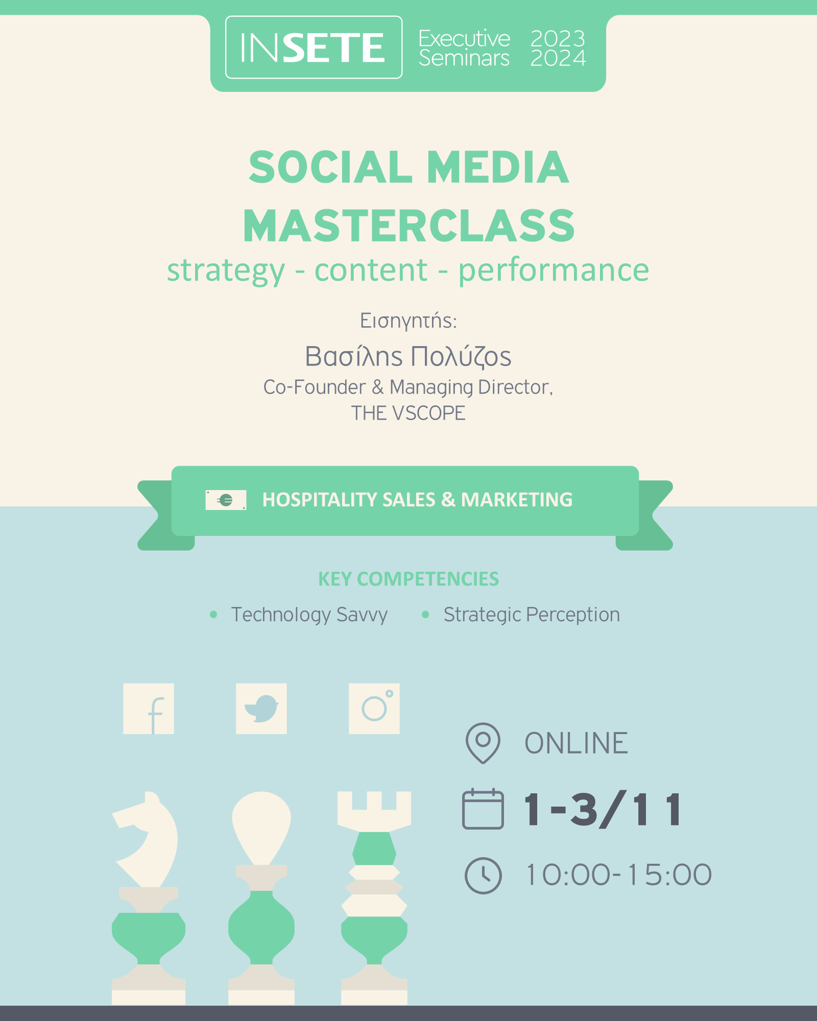 Το Social Media Masterclass, στοχεύει στο να δώσει στους συμμετέχοντες μία ολοκληρωμένη εικόνα, σε θεωρητικό και πρακτικό επίπεδο, για όλες τις απαιτούμενες ενέργειες στο συνεχώς μεταβαλλόμενο περιβάλλον των κοινωνικών δικτύων. Μέσω του webinar, οι συμμετέχοντες θα είναι σε θέση να χτίσουν τη στρατηγική τους στα Social Media, να δημιουργήσουν περιεχόμενο για την επιχείρησή τους στα πιο δημοφιλή networks (FB, Instagram, TikTok) καθώς επίσης και να αναπτύξουν και να βελτιώσουν τις Paid Campaigns τους μέσα από τον Ad Manager της Meta.