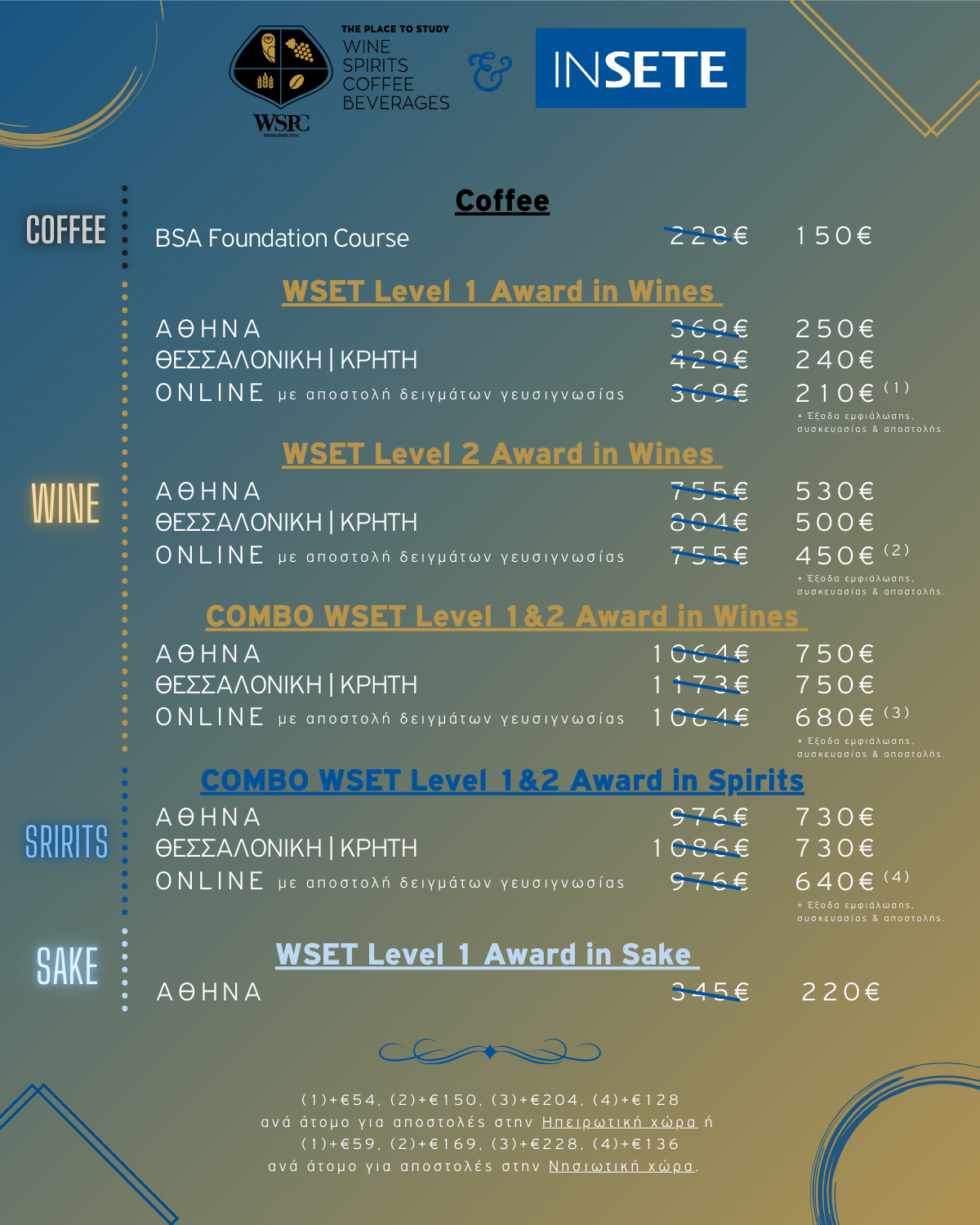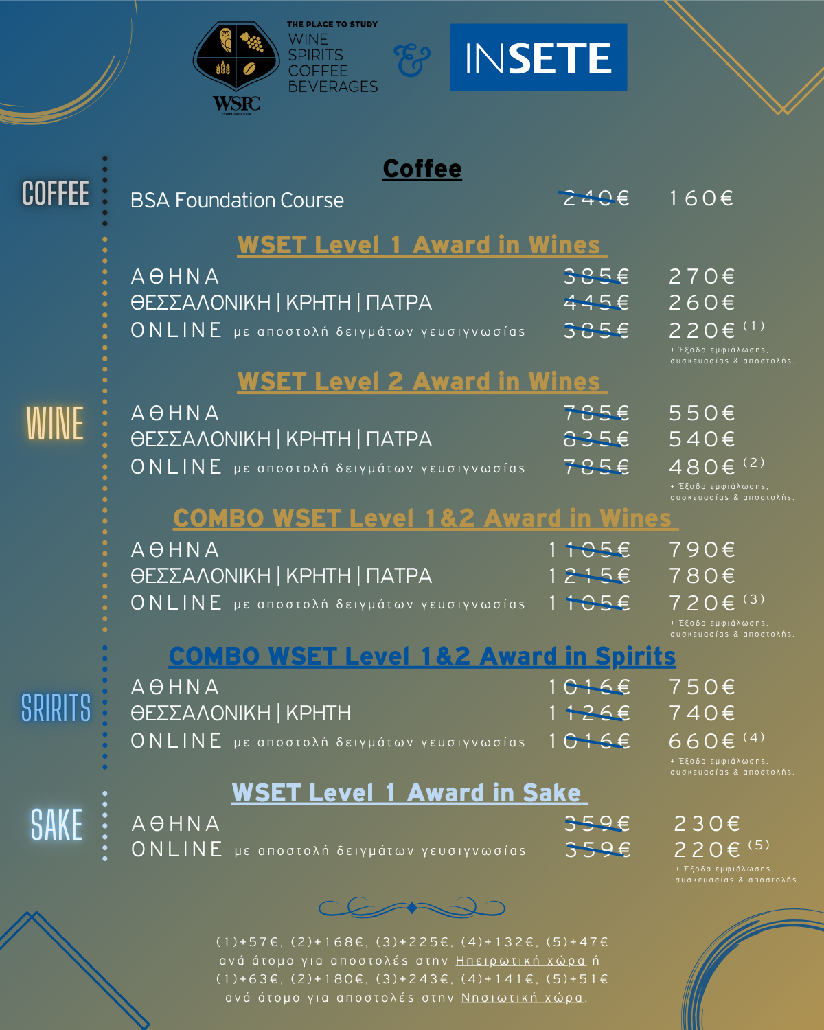 Το ΙΝΣΕΤΕ σε συνεργασία με το WSPC προσφέρει στους επαγγελματίες του τουρισμού τη δυνατότητα να ενισχύσουν τις γνώσεις και τις δεξιότητές τους στο κρασί, στα αποστάγματα και στα μη αλκοολούχα ποτά. Με τη νέα αυτή στρατηγική συνέργεια οι επαγγελματίες του κλάδου αποκτούν πρόσβαση στα υψηλού επιπέδου εκπαιδευτικά προγράμματα του WSPC, σε ιδιαίτερα προνομιακές τιμές συμμετοχής.