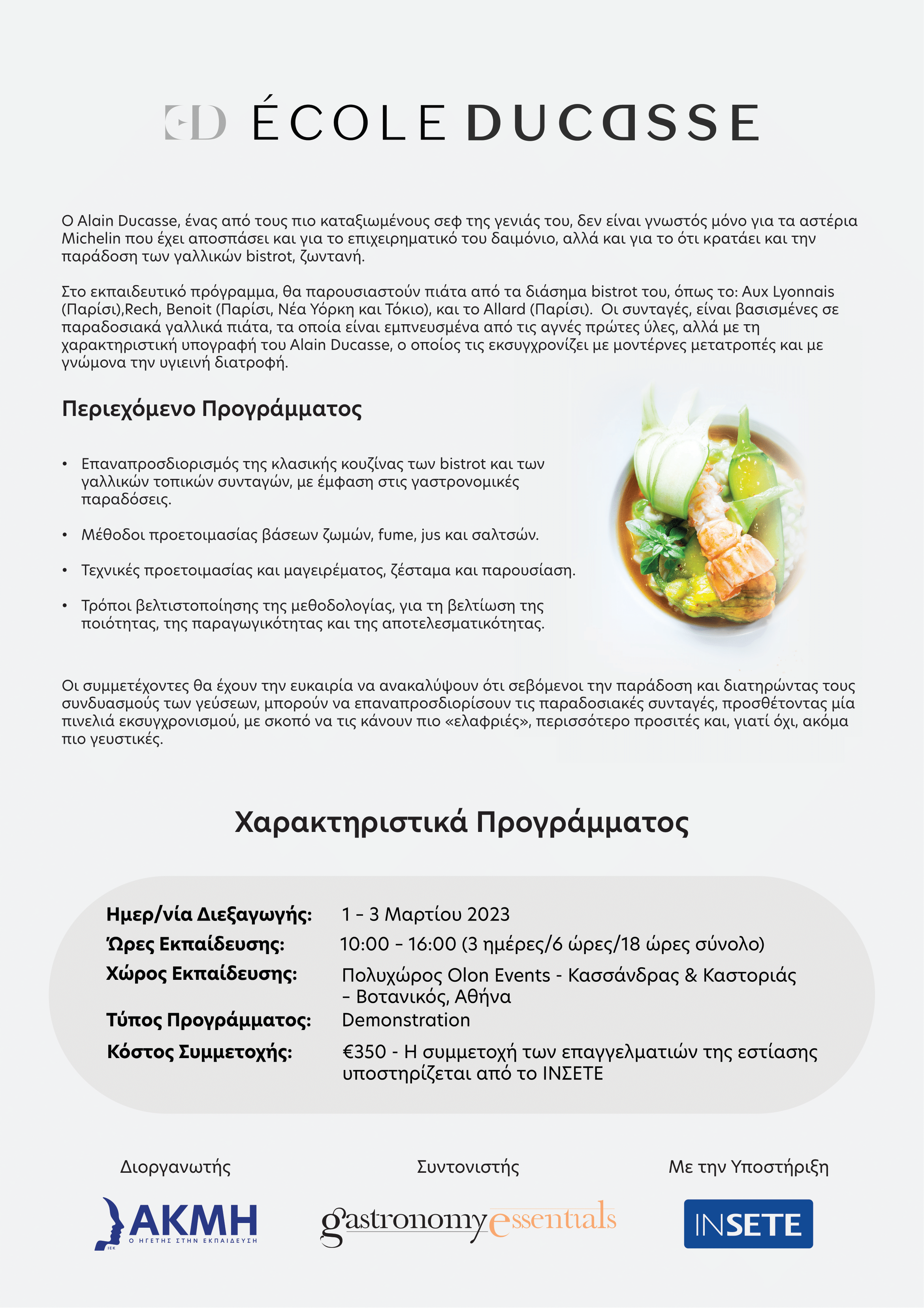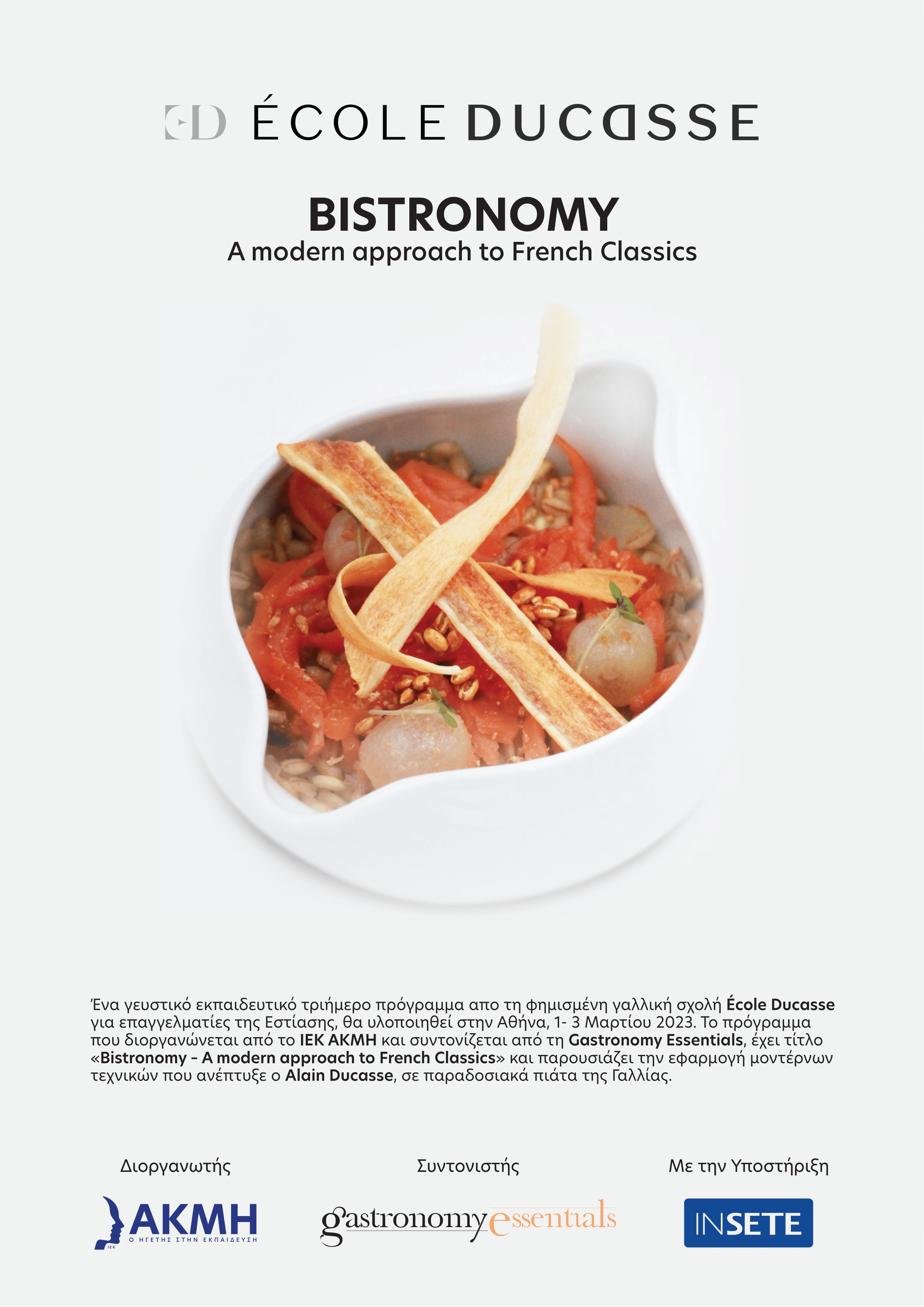 Ένα γευστικό εκπαιδευτικό τριήμερο πρόγραμμα για επαγγελματίες της εστίασης, θα υλοποιηθεί στην Αθήνα στη 1 με 3 Μαρτίου 2023, στα πλαίσια των ετήσιων εκπαιδευτικών δράσεων με τη φημισμένη σχολή Ecole Ducasse και με τίτλο «Bistronomy – A modern approach to French Classics».
