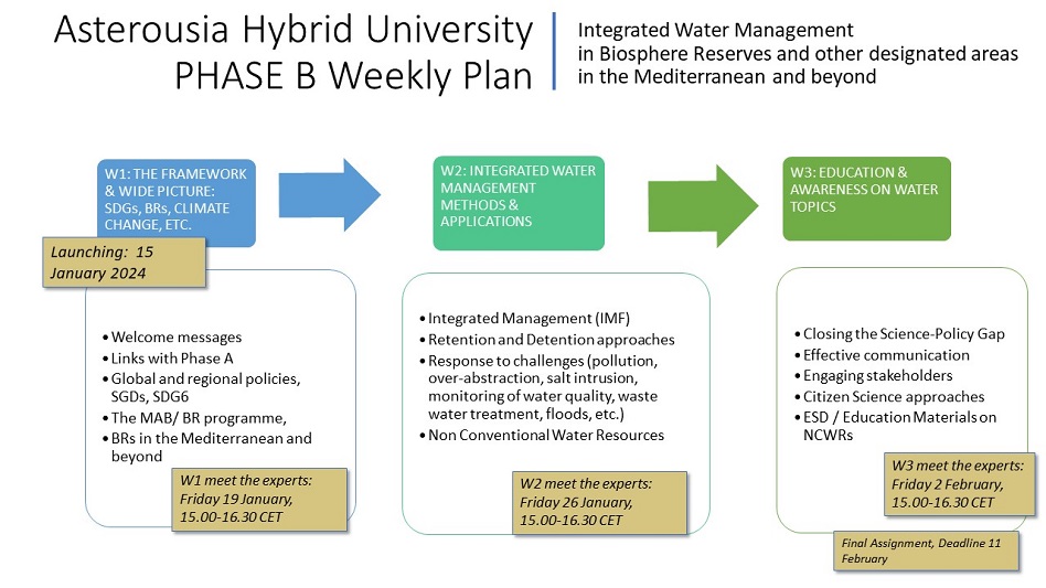 - Week 1: 15-21 January 2024, The wide picture & the challenges: The overall context; The UNESCO MAB Programme; Global and regional policies; BRs in the Mediterranean and beyond ; The SDGs & BRs; The climate & water crisis in the Mediterranean, etc.
