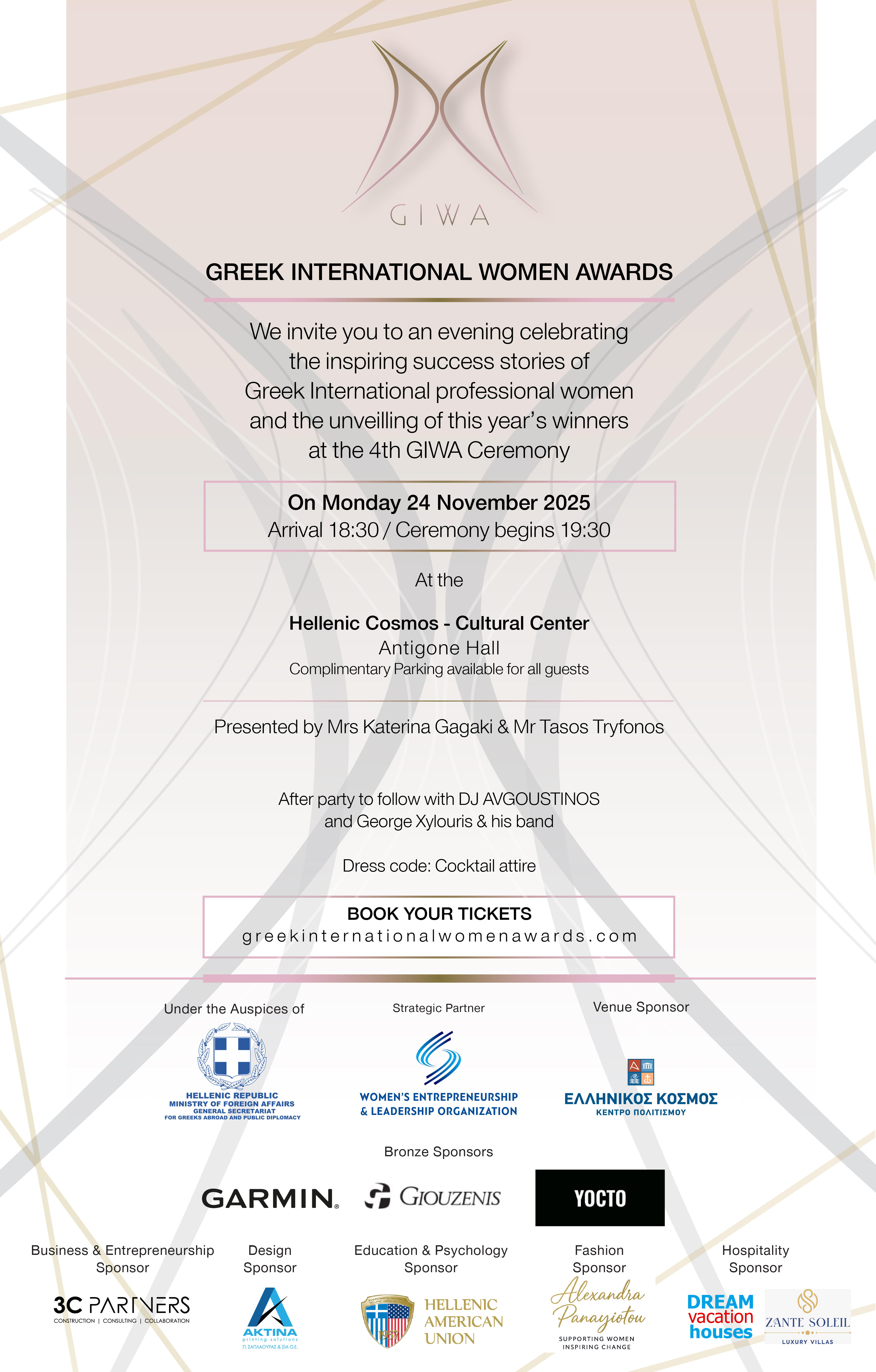 Στις 24 Νοεμβρίου 2025, στις 19:30, στον εμβληματικό χώρο του Ελληνικού Κόσμου – Ίδρυμα Μείζονος Ελληνισμού, τα Greek International Women Awards (GIWA) υποδέχονται την παγκόσμια κοινότητα για μια βραδιά που αναδεικνύει το ταλέντο, την ηγεσία και τη δυναμική των Ελληνίδων σε όλο τον κόσμο.